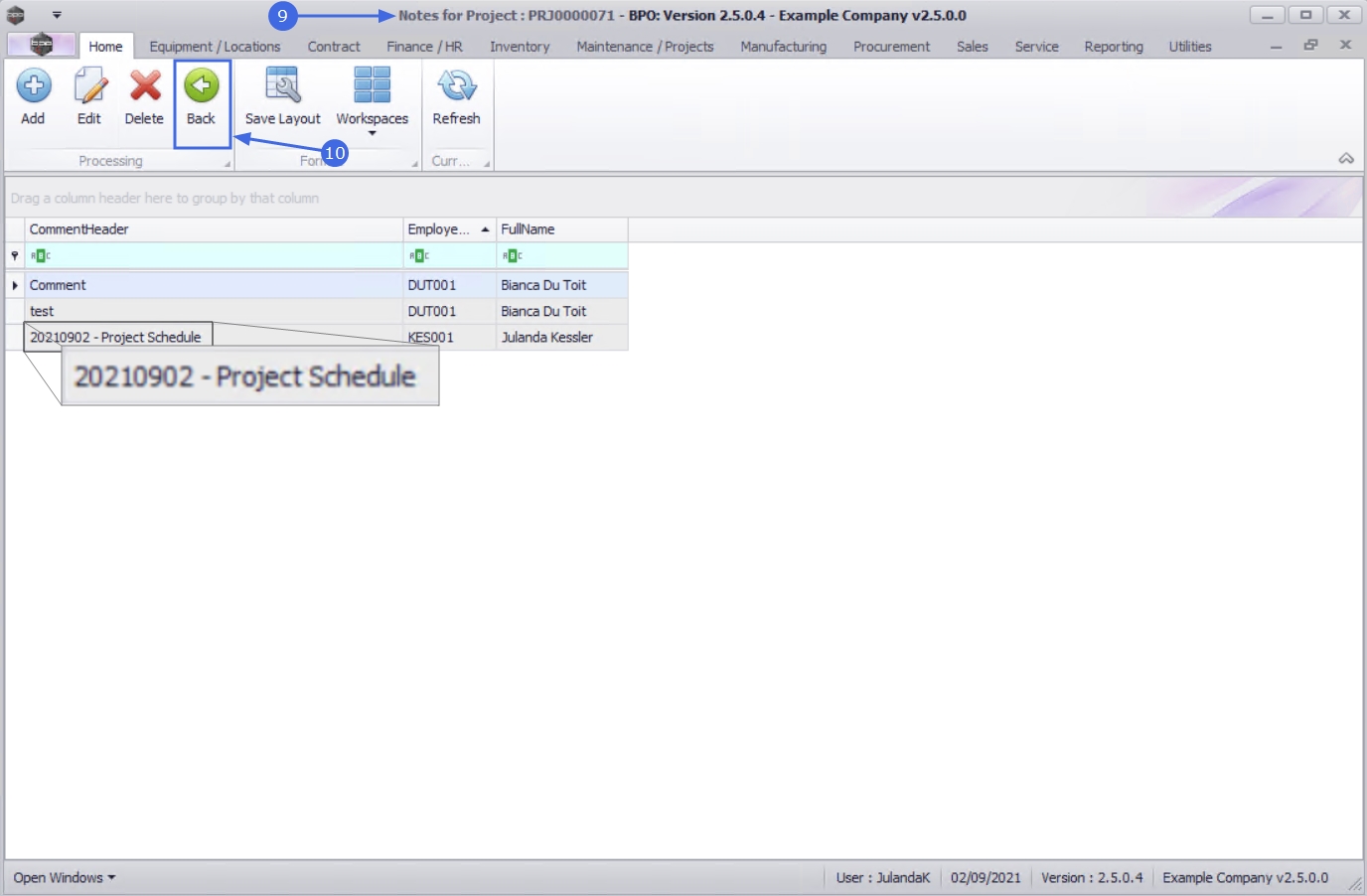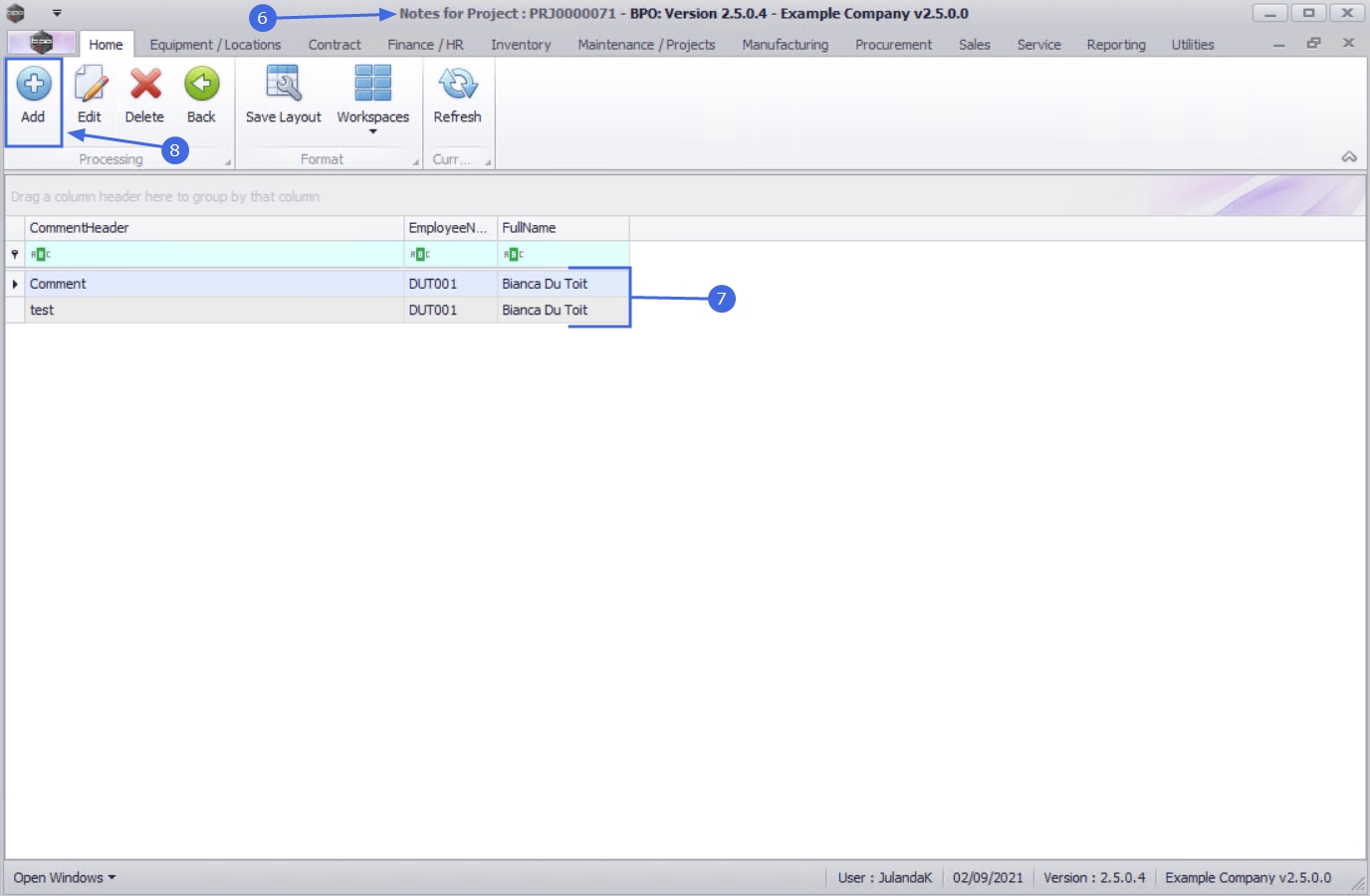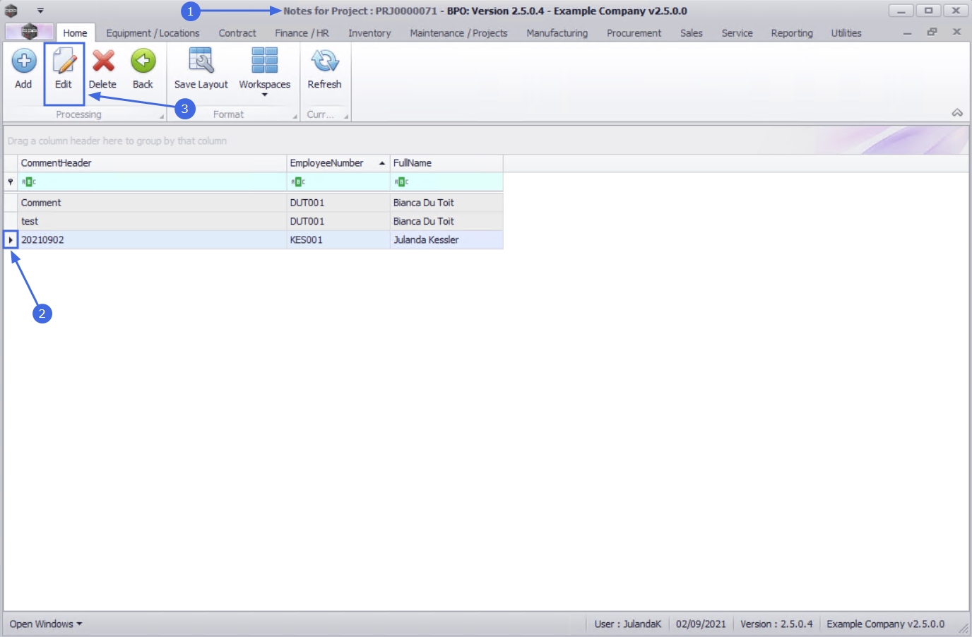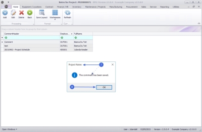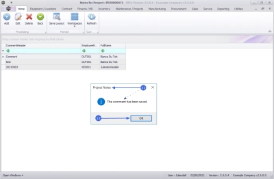1. You will return to the Notes for Project screen where you can view the changes made to the Comment Header.