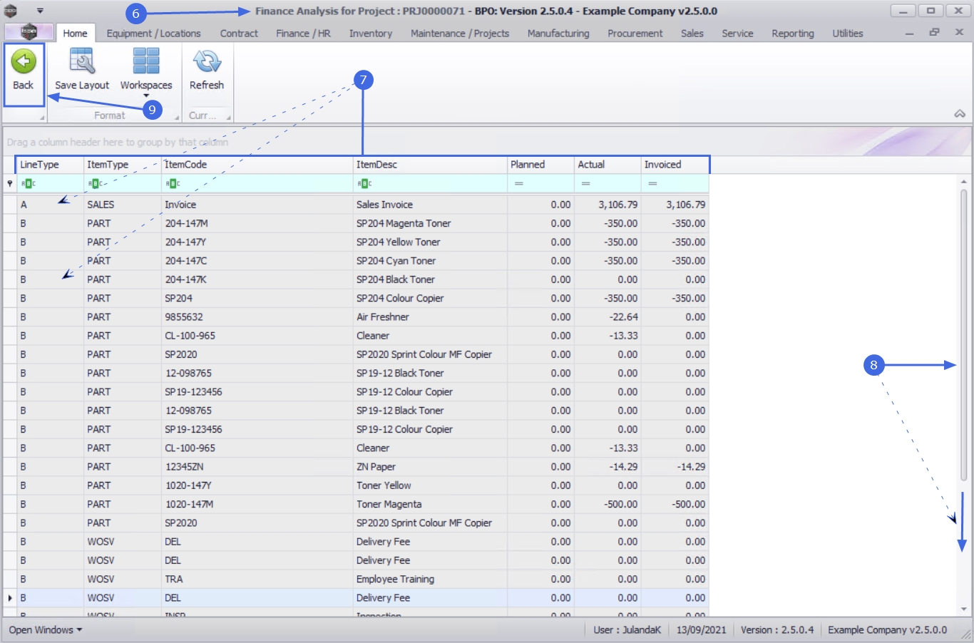 From this screen you can view a list of the financial transactions linked to the project by line type, Planned and Actual Cost, as well as the Invoice Amount.