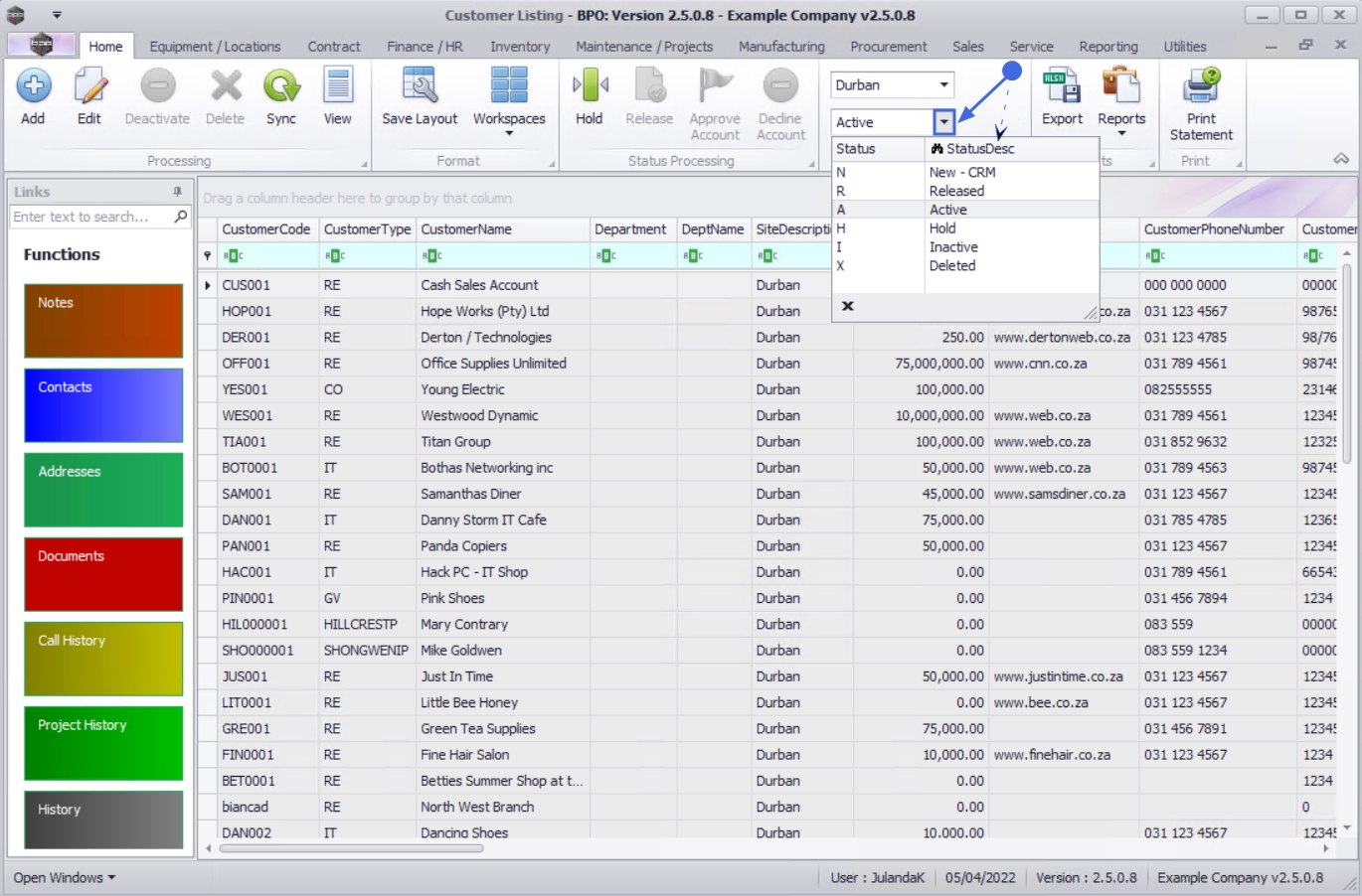 All the customers in the Customer Listing screen are sorted depending on the Site and Status selected: