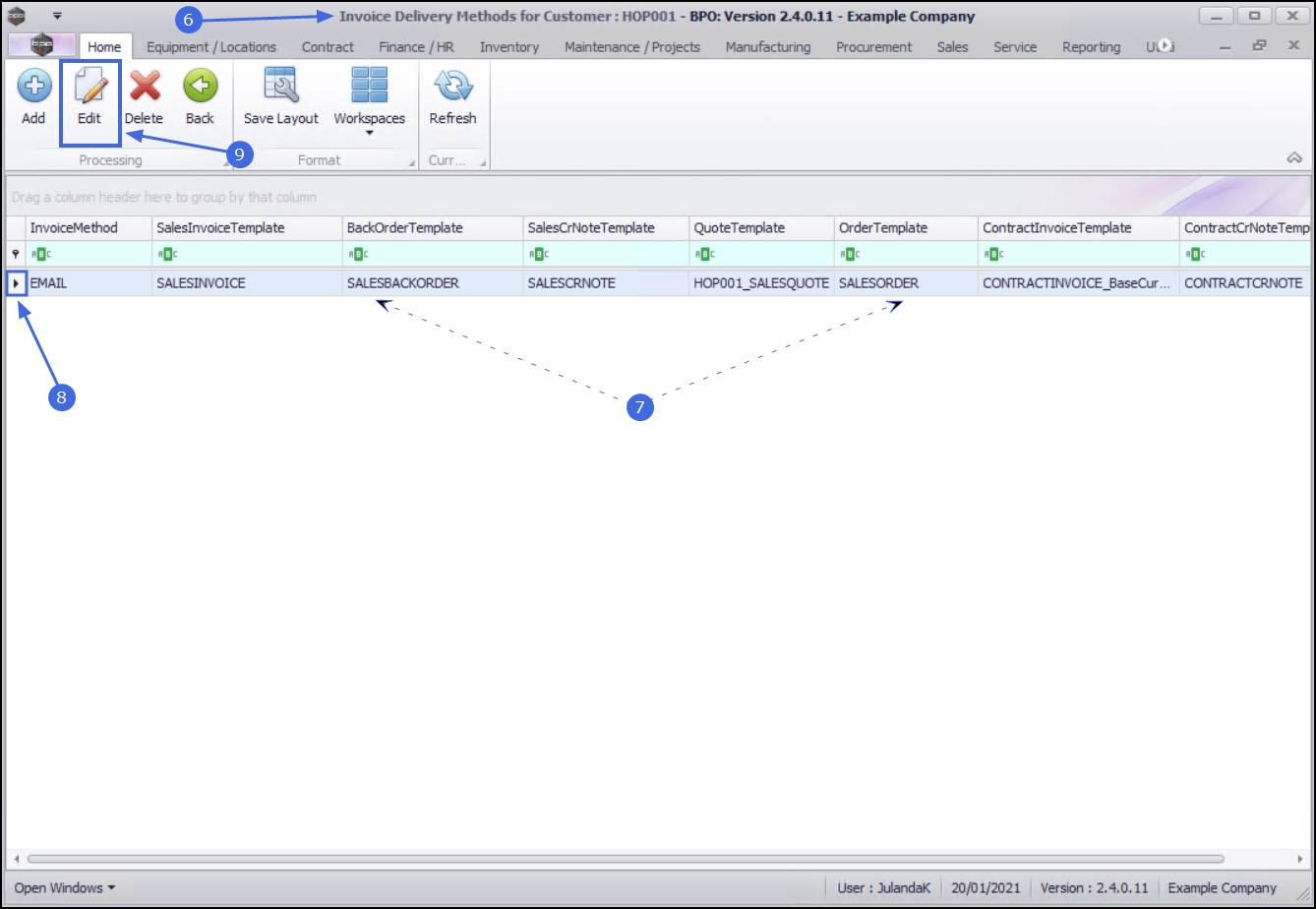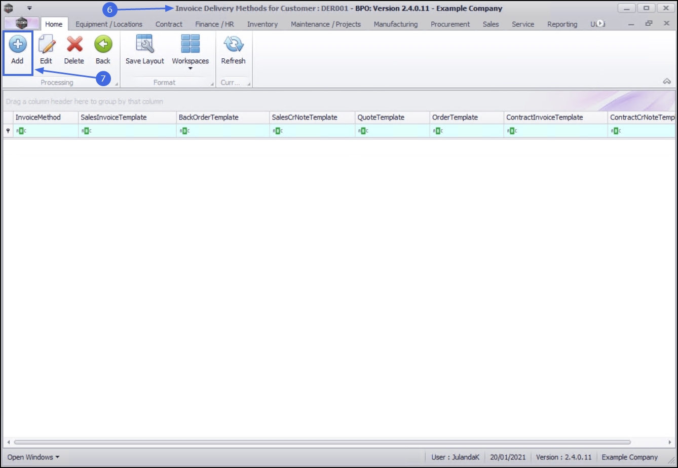 - The Invoice Delivery Methods for Customer: [Customer Code] screen will open.
