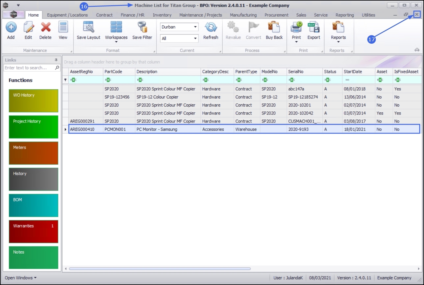 - You will return to the Machine List screen where you can view the customer asset you have created.