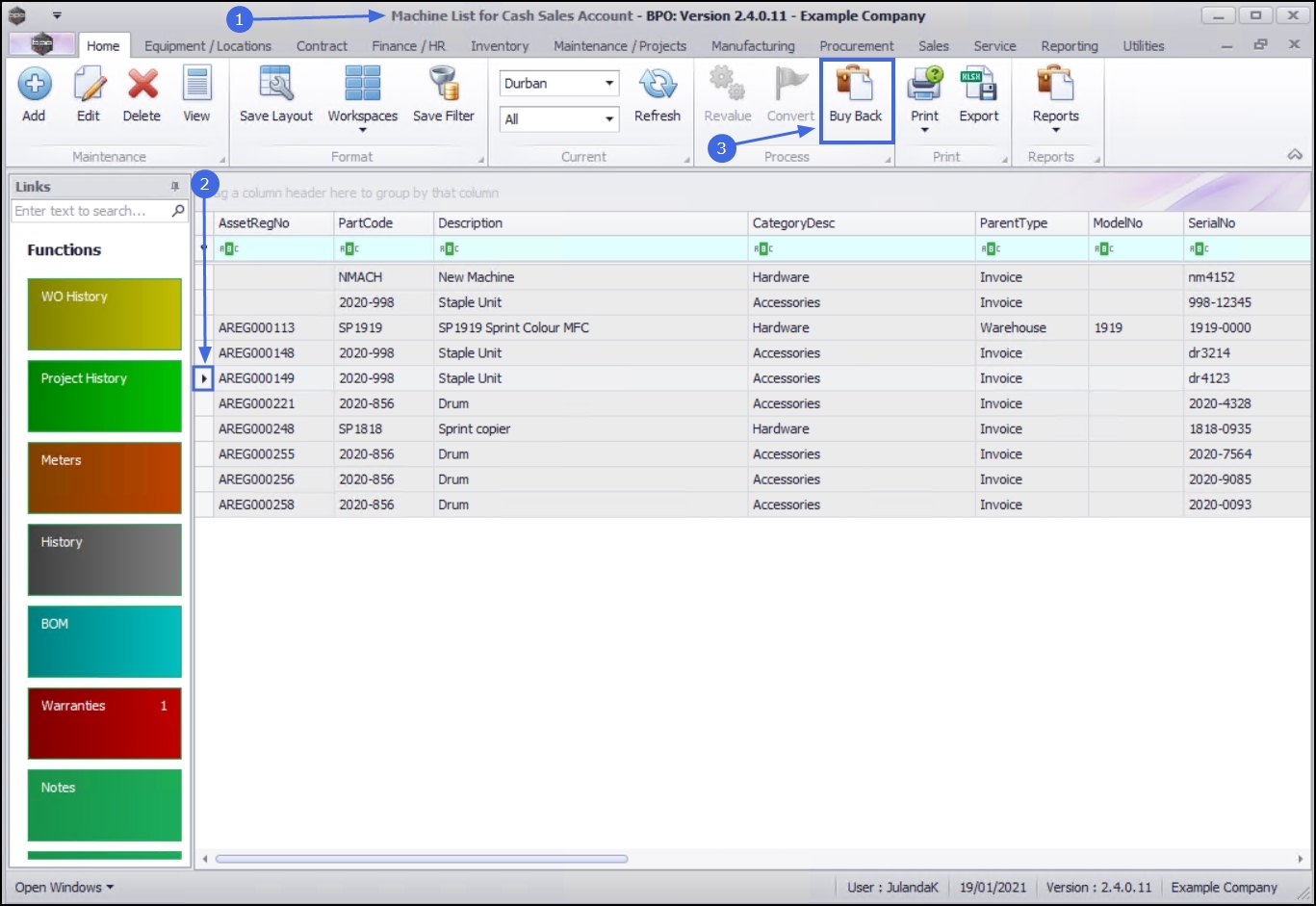 - Select the row of the Customer Asset / equipment item that you wish to buy back.