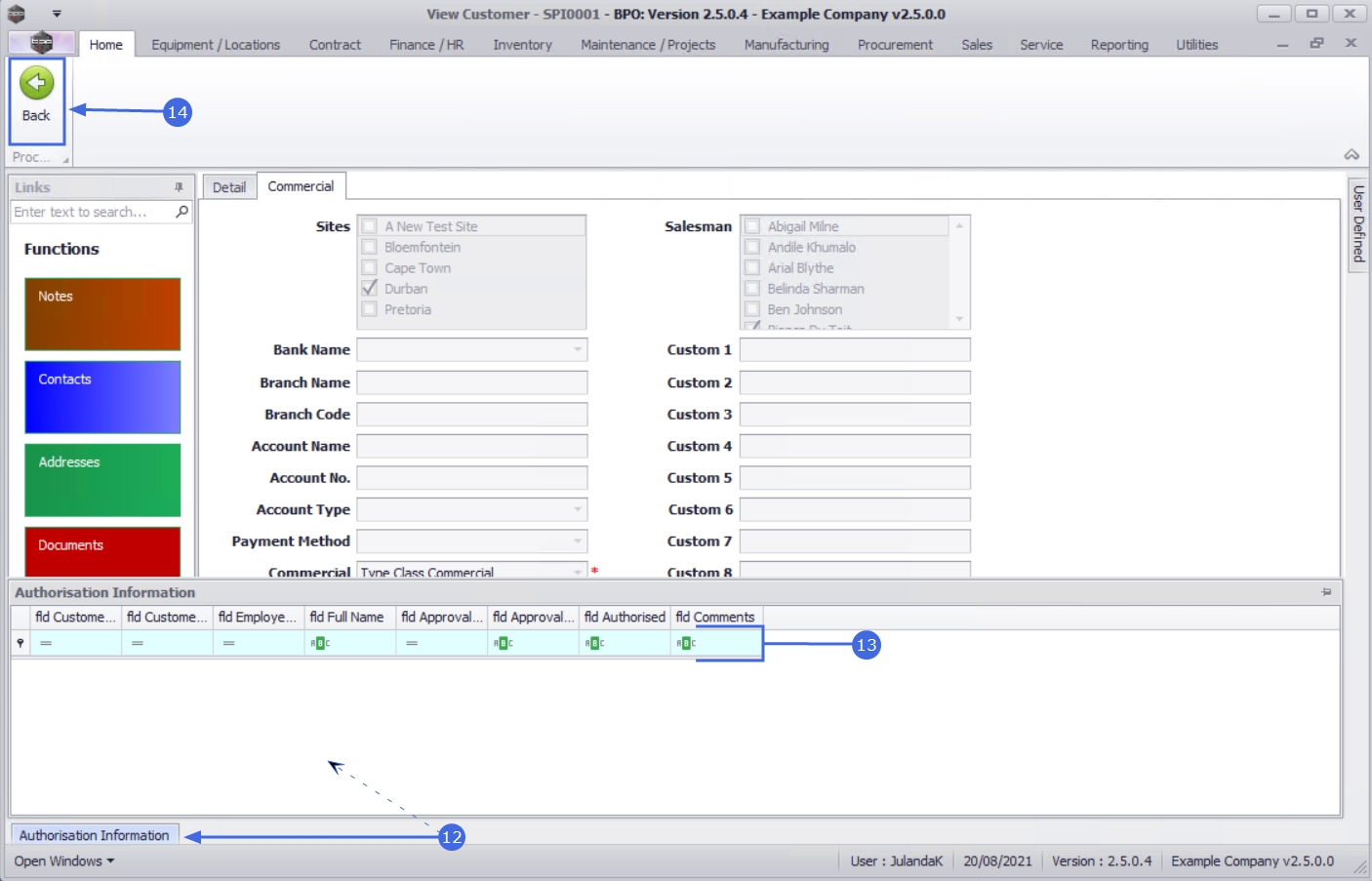 - Click on the Commercials tab to view the Site and Salesman name that the customer is linked to as well as the Banking details and Custom 1 - 10 fields