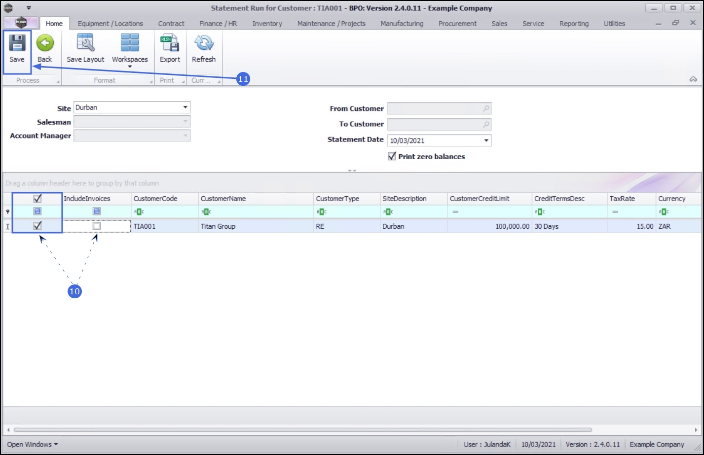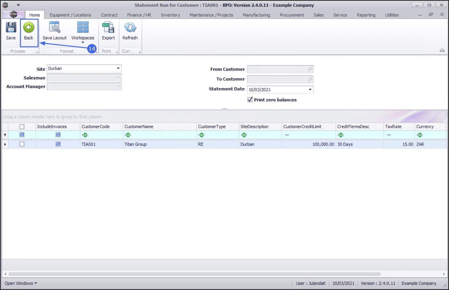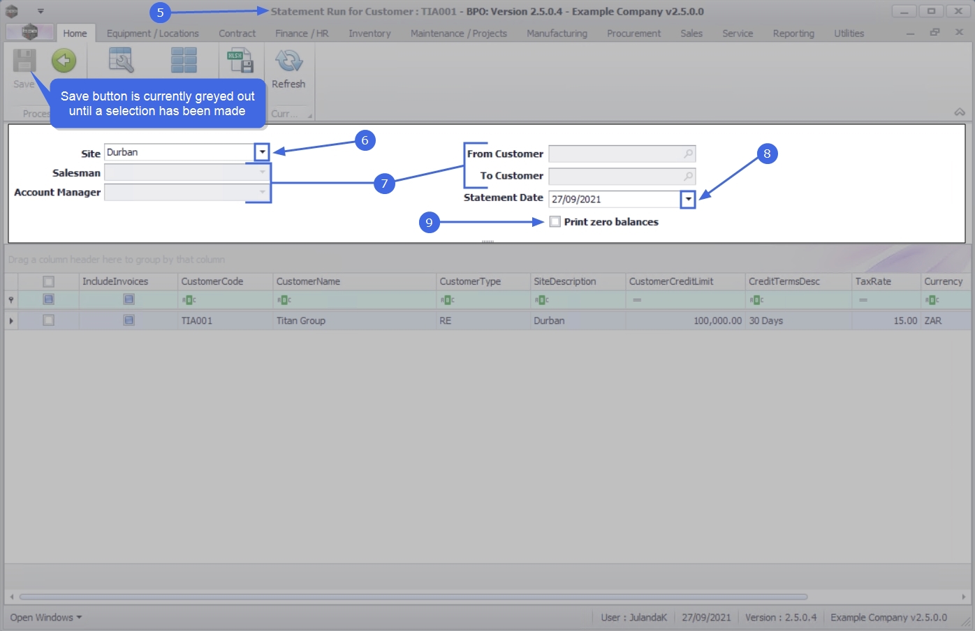 - The Statement Run for Customer : [customer code] screen will be displayed.