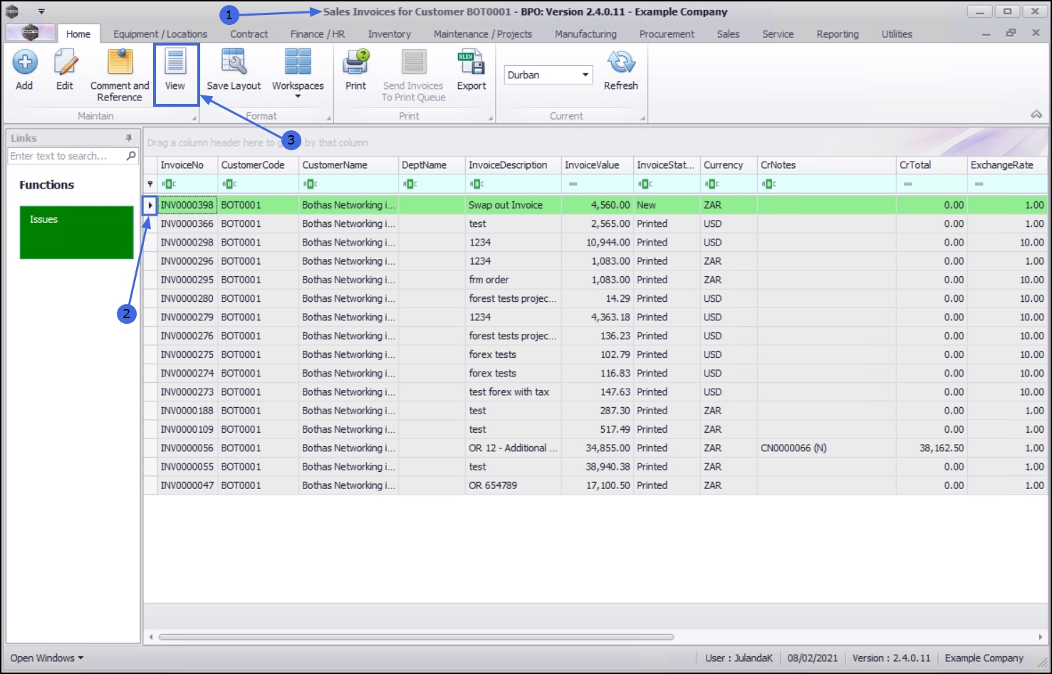 - From the Sales Invoices for Customer [customer code] screen,
