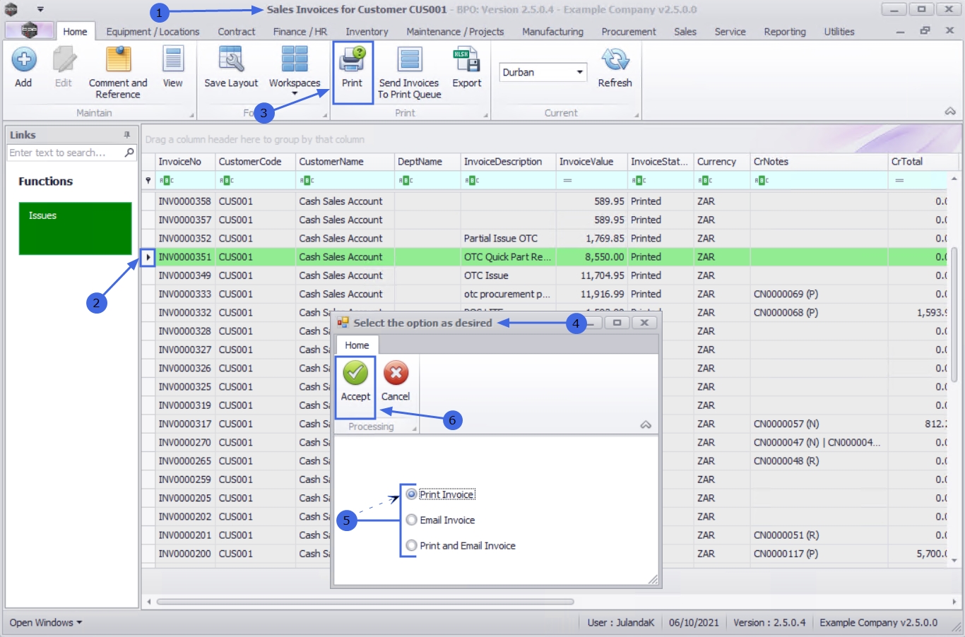 - You can send Invoices to the Print Queue directly from the Sales Invoices for Customer [customer code] listing screen, instead of going to the Print Queue Reprint screen. This means that a batch of invoices can be send to the customer.