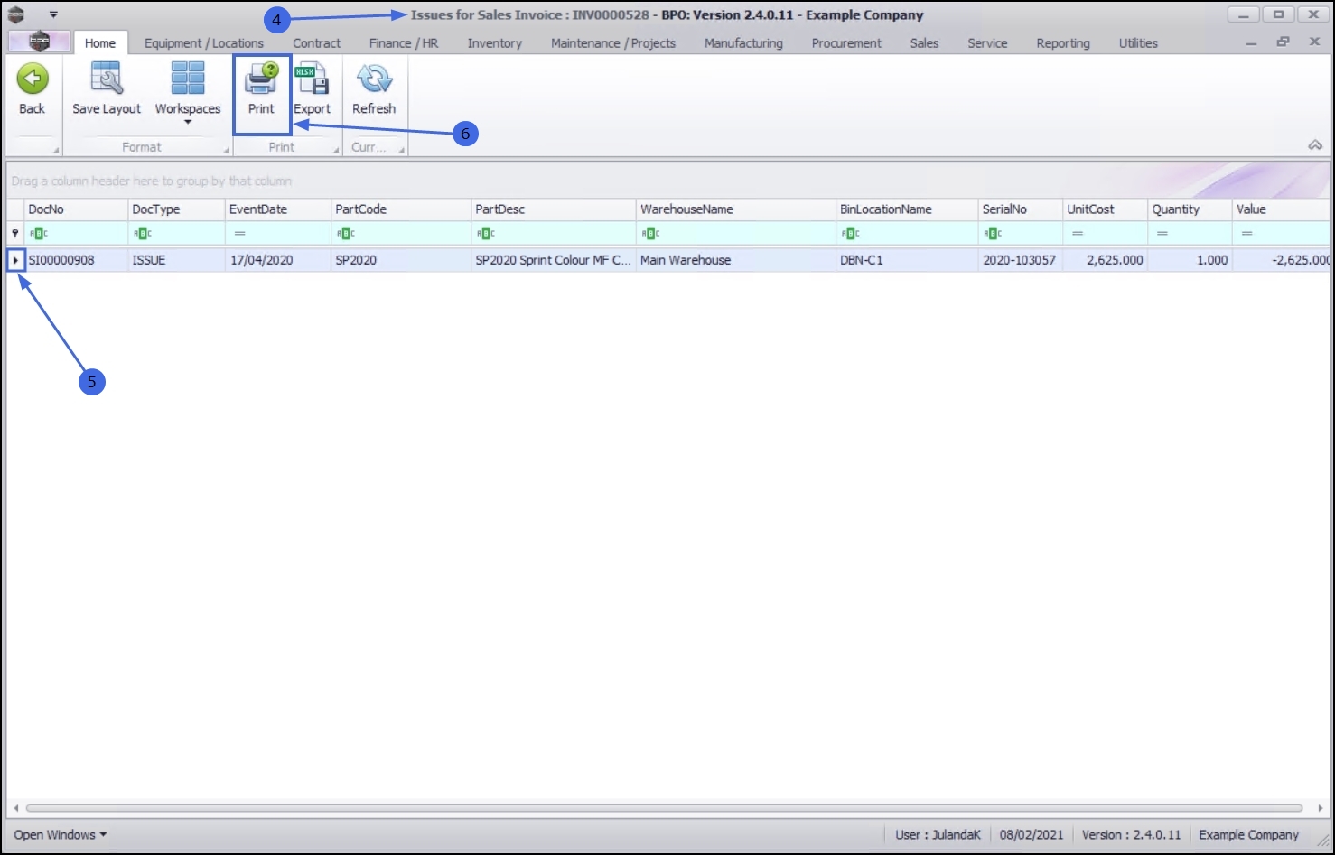 - Click on the row of the Part Issue Note you wish to print.