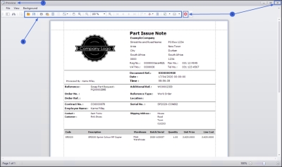 - From here you can make cosmetic changes to the document, as well as Save, Print, Add a Watermark, Export or Email the Part Issue Note.