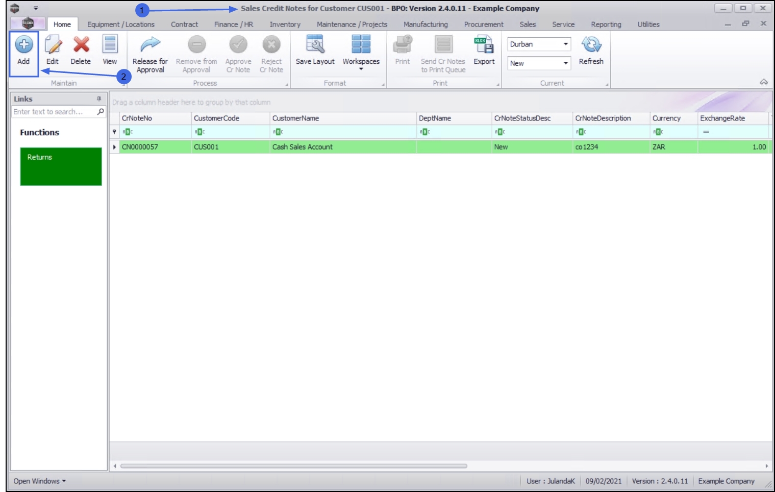 - From the Sales Credit Notes for Customer [customer code] screen,