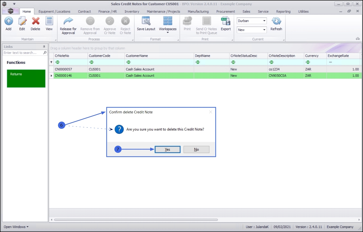 - When you receive the Confirm delete Credit Note message;