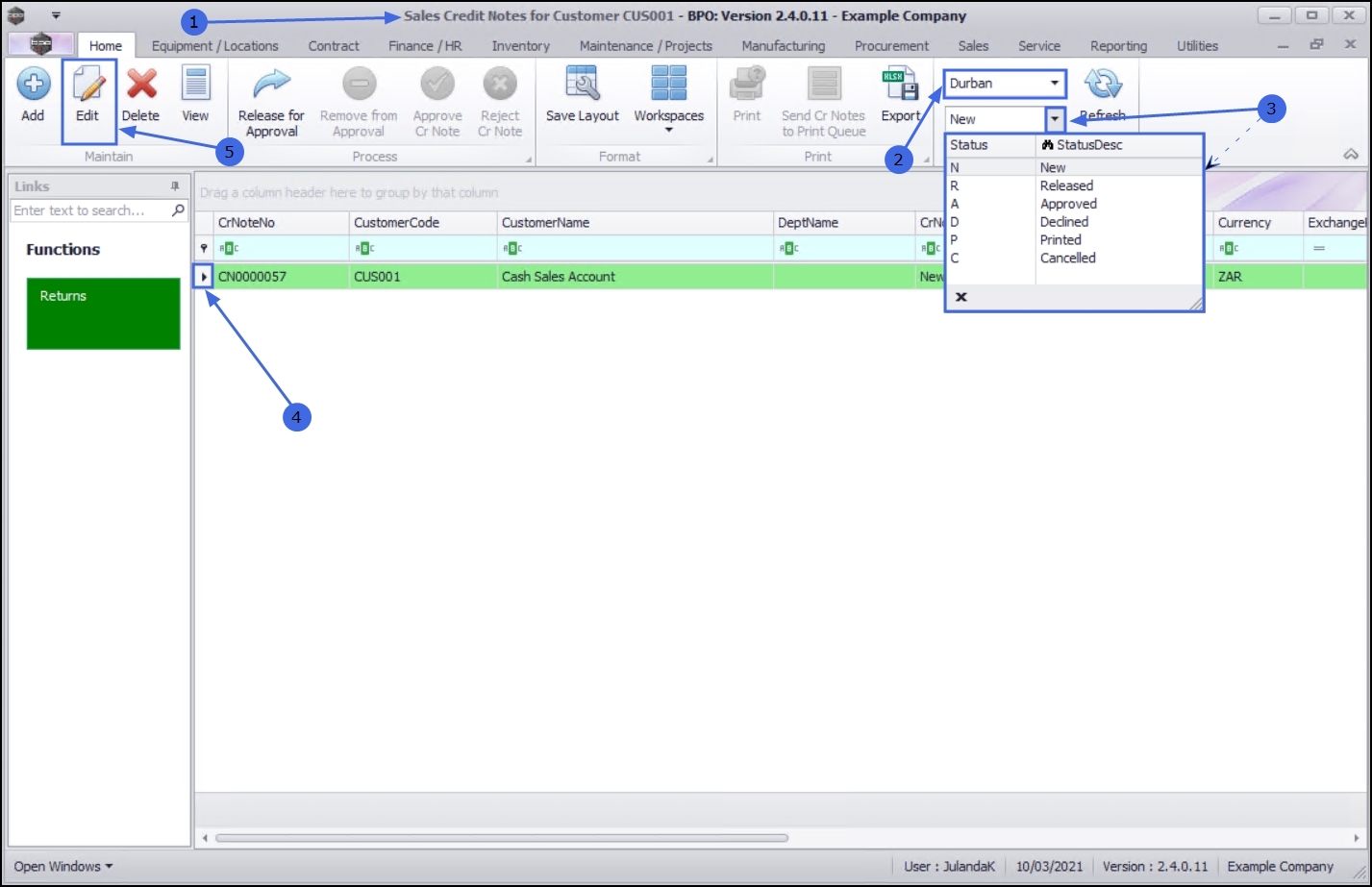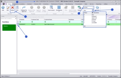 You can release credit notes for approval only in the New status. - Select the row of the Credit Note you wish to release for Approval.