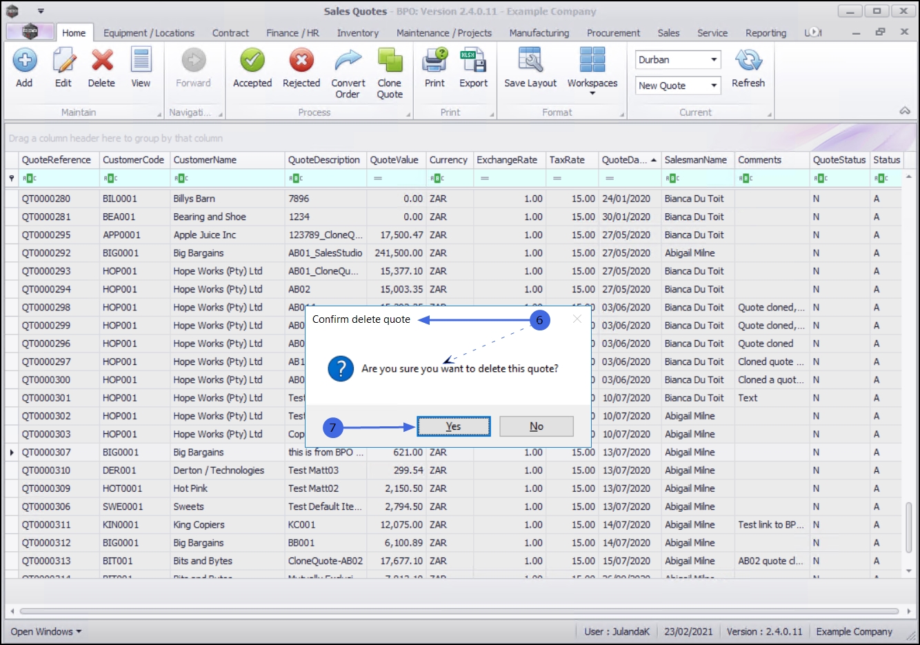 The Sales Quotes listing screen will be updated and the sales quote that has been deleted will no longer be listed.