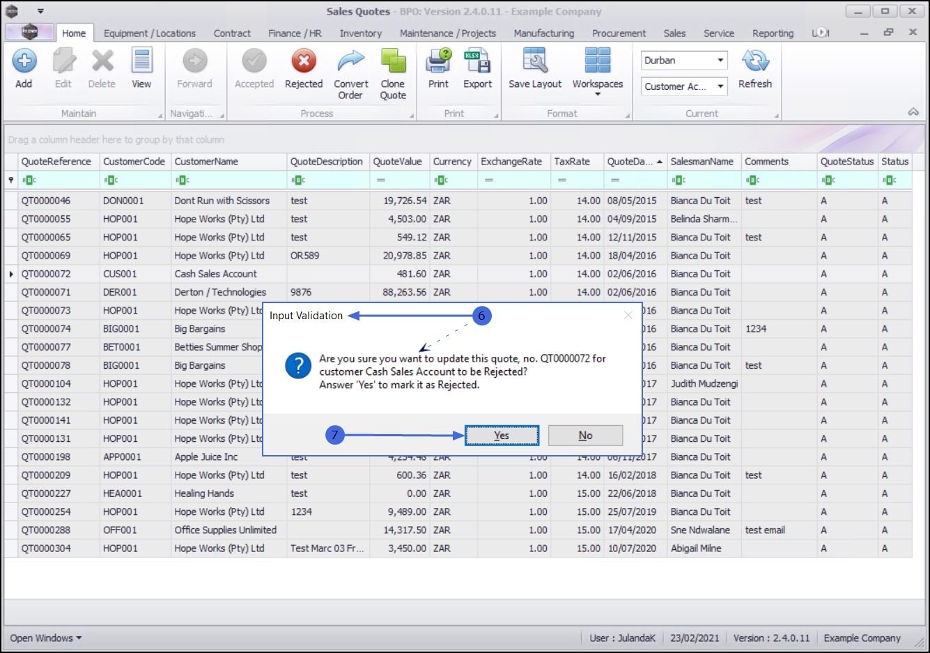• Are you sure you want to update this quote, no. QT[quote number] for customer [customer name] to be Rejected? Answer 'Yes' to mark it as Rejected.