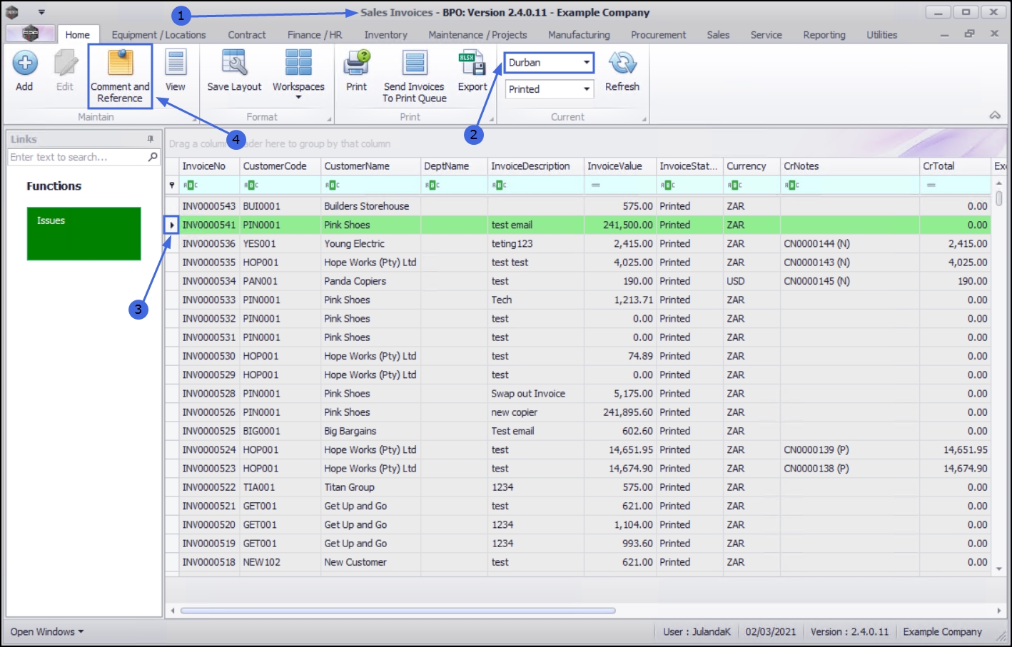 - Click on the row of the invoice you wish to Add or Edit a comment and / or reference.