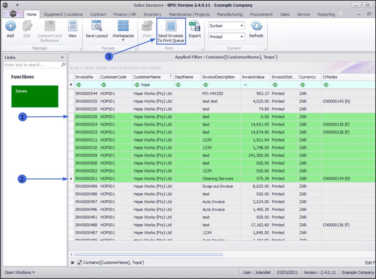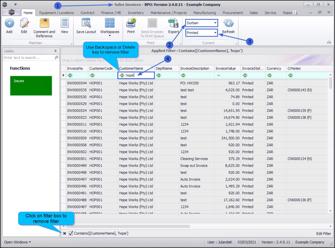 - Start typing the name of the Customer in the filter row of the Customer Name column, to display a list of all the Sales Invoices for the Customer.
