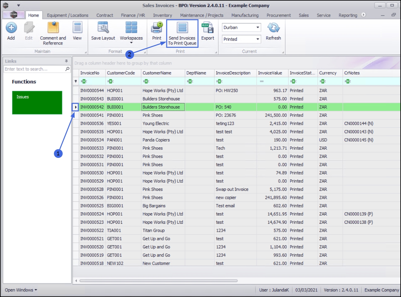 - Click in the row of the Invoice you wish to Send to the Print Queue.