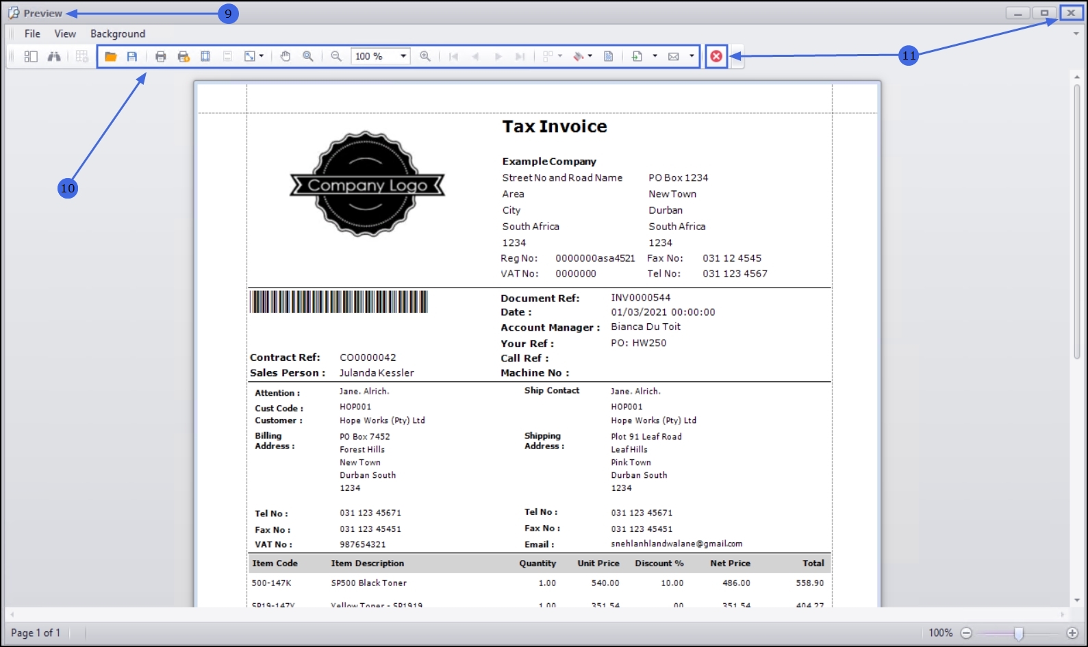Tax Invoice. Each time thereafter, it will state Copy - Tax Invoice. - From the preview screen you can make cosmetic changes to the Tax Invoice, as well as Save, Zoom, Add a Watermark, Export or Email from the preview screen.