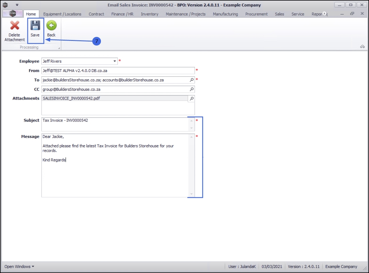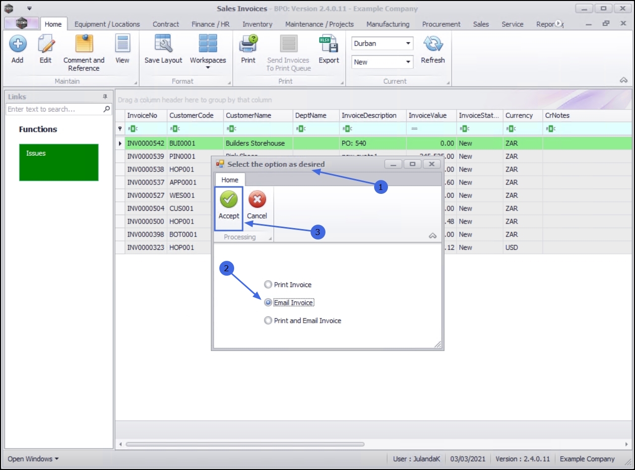 When using the 'Email' option to send a Sales Invoice, note that it will be emailed via the BPO Email Service on the server and not from Microsoft Outlook on your desktop.