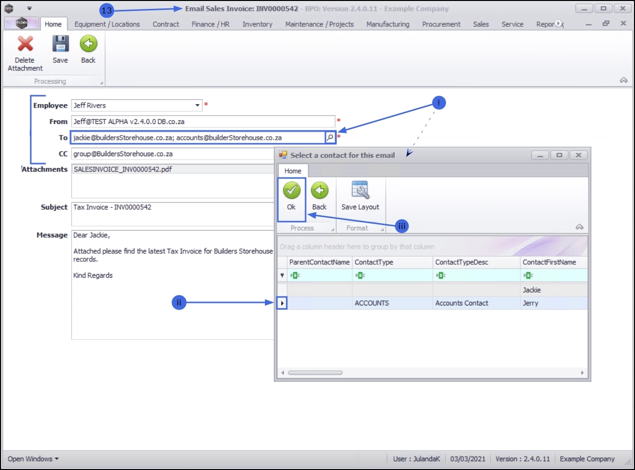 Additional email addresses can be added to either the To: or CC: by separating the email address with a [;]. - The example has the accounts contact person added to To:jackie@builderStorehouse.co.za; accounts@builderStorehouse.co.za.