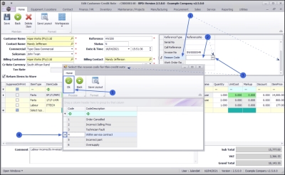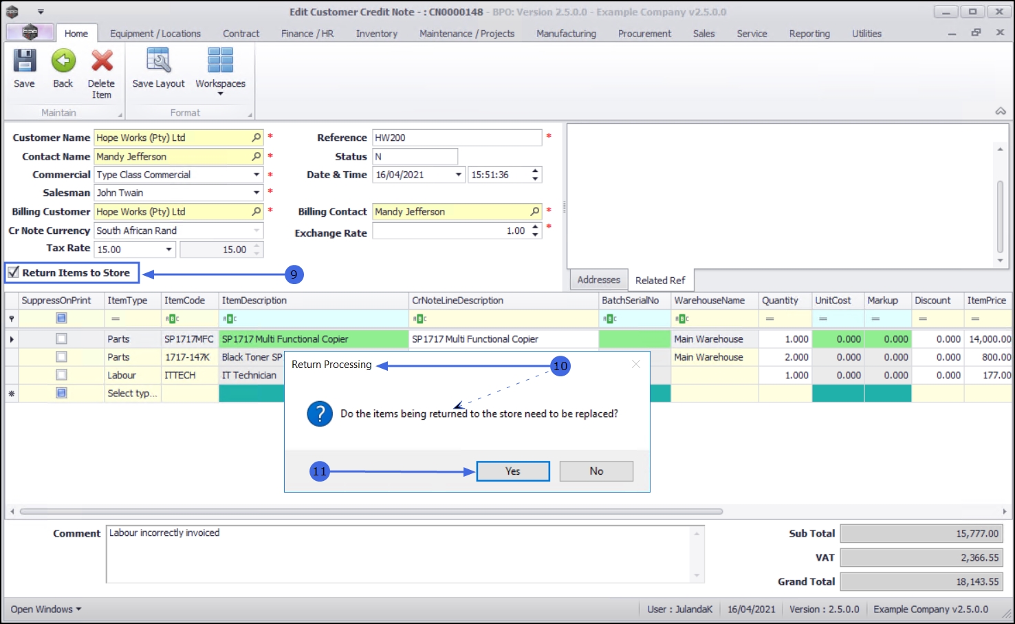 Note that the example has the Return Items to Store check box unavailable because the Credit Note currently only has labour listed and therefore no items need to be returned to store.