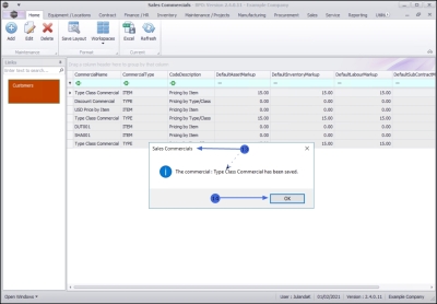 The commercial specifics grid displays the Markup, Discount and FixedCost for specific items, e.g. discount on a certain labour type, or a consumable item, etc.