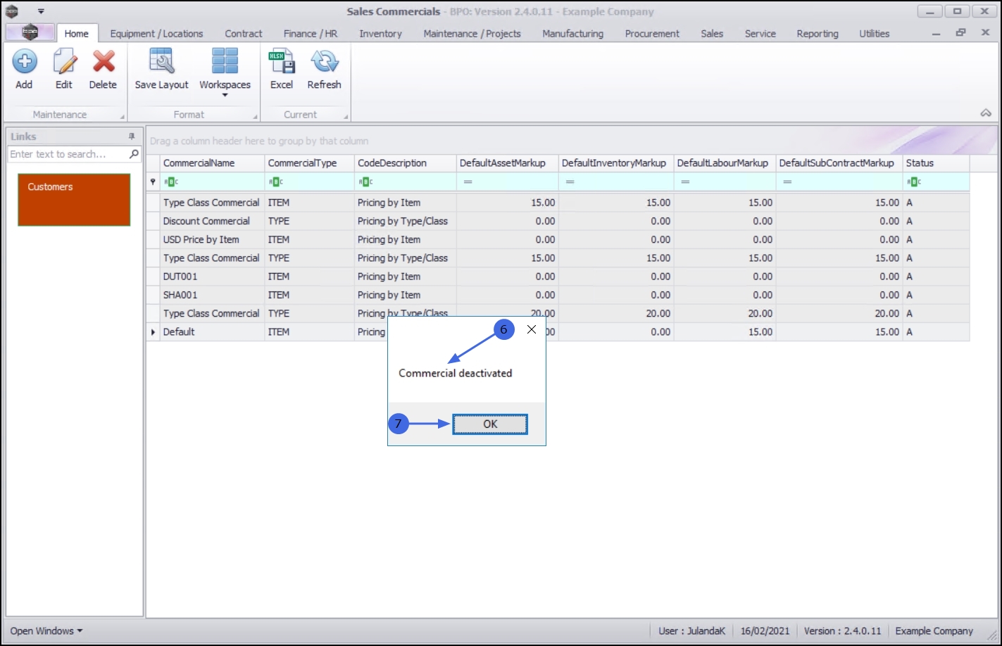 It is a good habit to first view the Customer list for the Commercial, to ensure that no Customers are still linked to the commercial, before deactivating it.