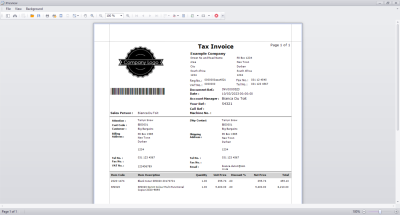 Note that when you print the Invoice for the first time, it will display Tax Invoice. The next time you print the Invoice, it will display Copy - Tax Invoice. - From the preview screen you can make cosmetic changes to the document as well as Save, Zoom, Add a Watermark, Export or Email the tax invoice.