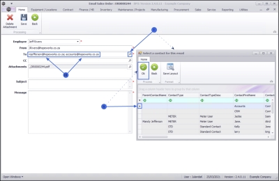 - To add an additional contact person, click on the search button to select and add the contact to the email. The second email address will be separated with a [;], e.g. mjefferson@hopeworks.co.za; accounts@hopeworks.co.za.