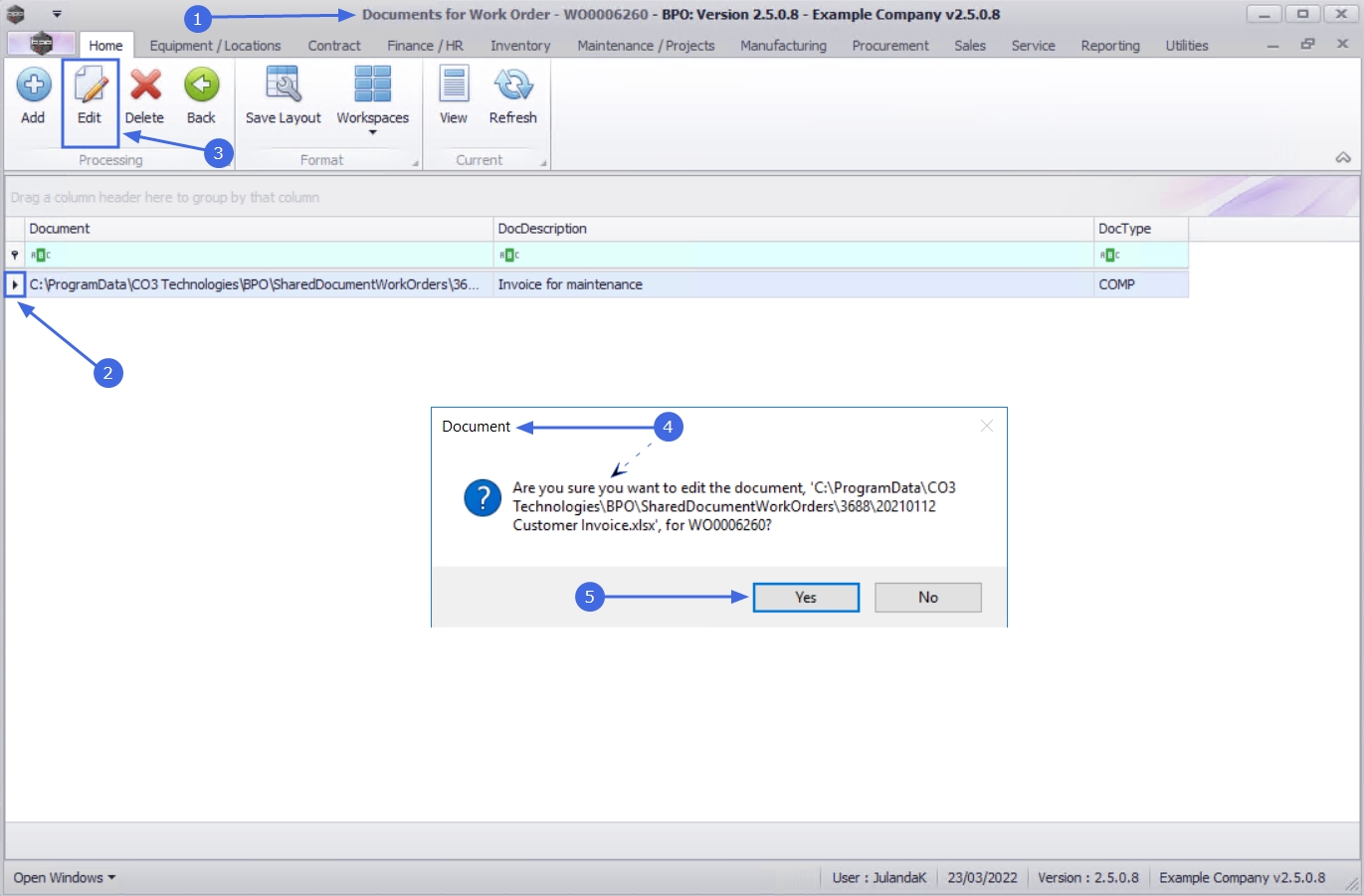 - Are you sure you want to edit the document, [file path and document name] for [work order code]?