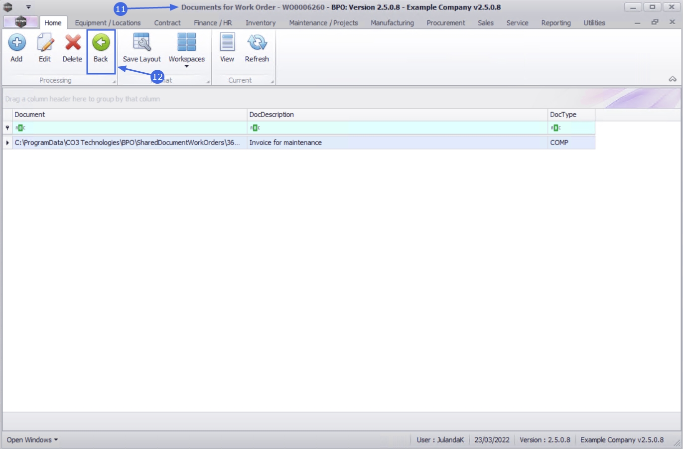 - When you have finished reviewing the document, close the screen to return to the Documents for Work Order screen.