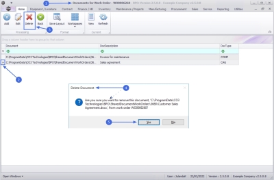 - Are you sure you want to remove this document, [document path and file name], from work order [work order code]?