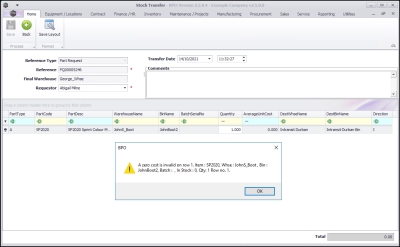 A zero cost is invalid on row []. Item: [], Whse: [], Bin: [], Batch [], In Stock: 0, Qty: [] Row no. []
