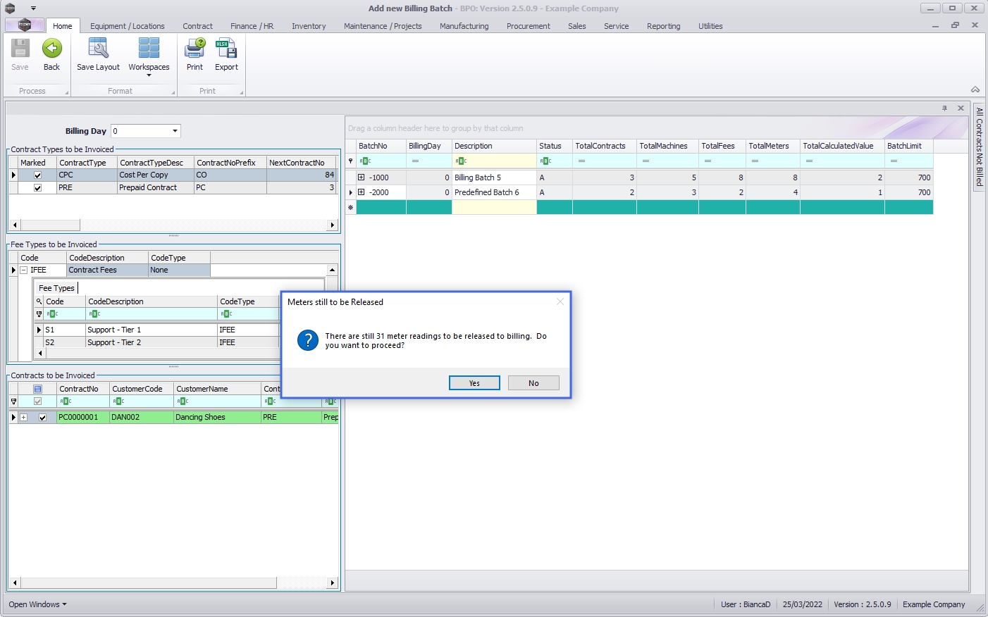 - If you are configuring batches, but not yet billing, you can continue by clicking on Yes, otherwise click on No and first make sure the meter readings are released, so that they are available to be billed when the batch is run, then come back to setting up your batches.