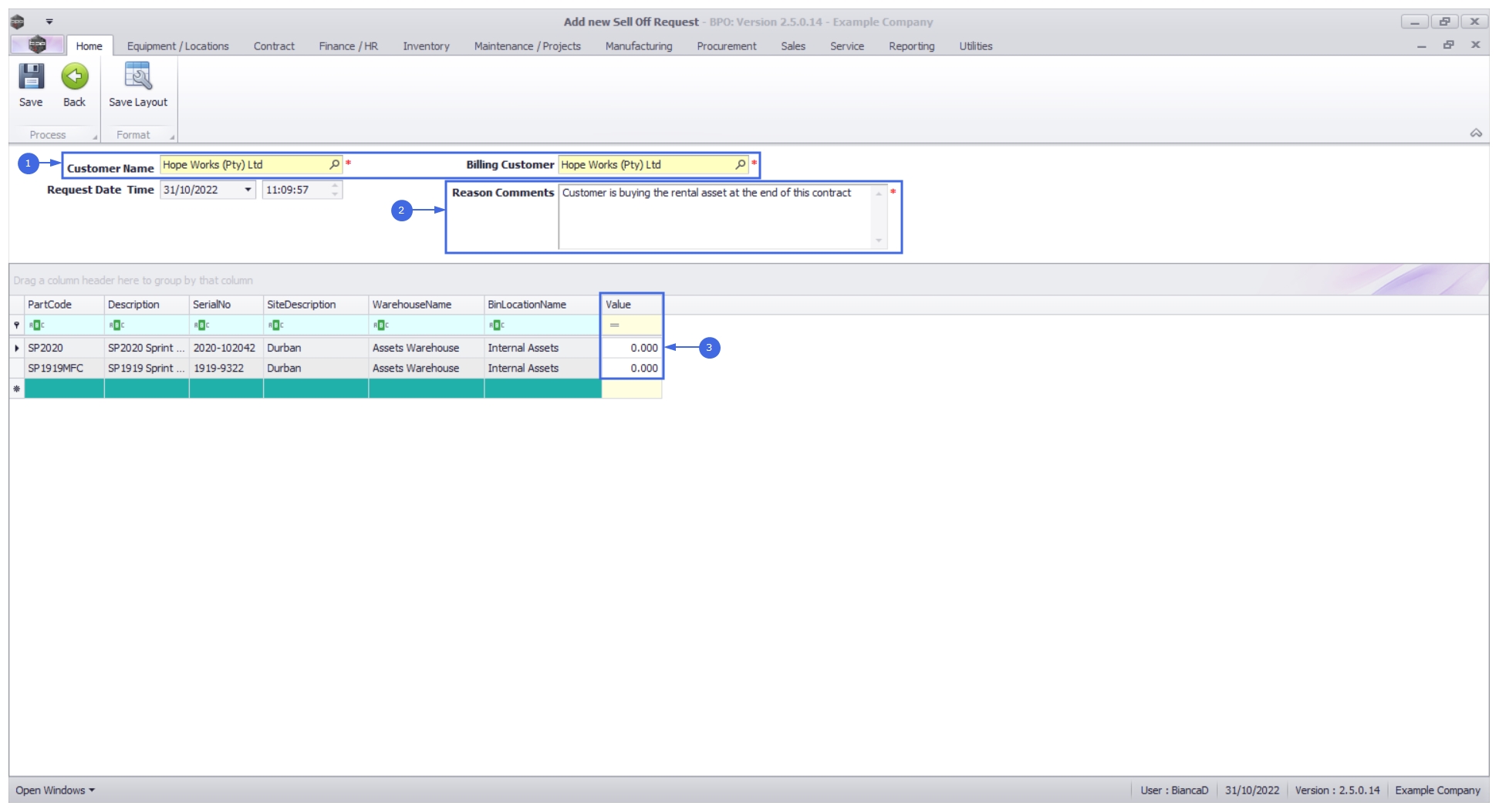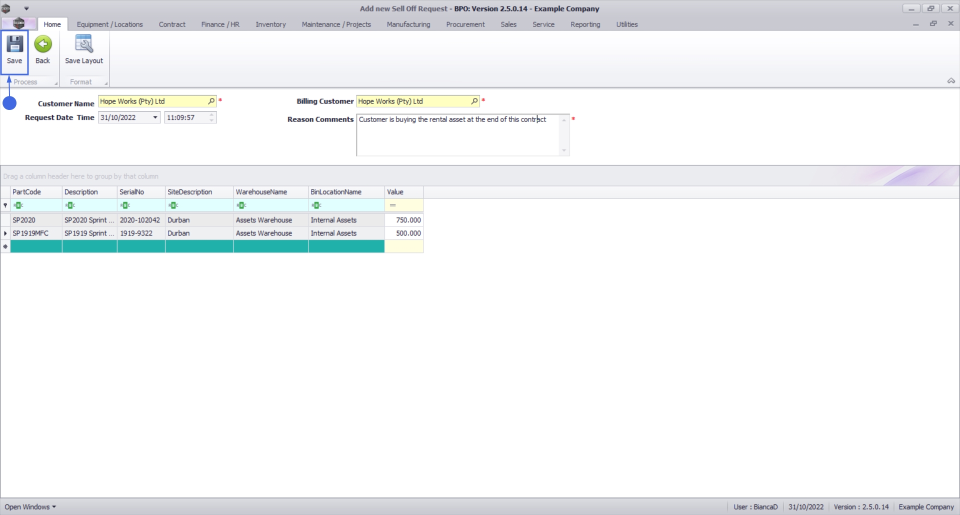 For expired contracts that remain active, you have the ability to sell off serial numbers that have been selected, if the selected items are internal assets.
