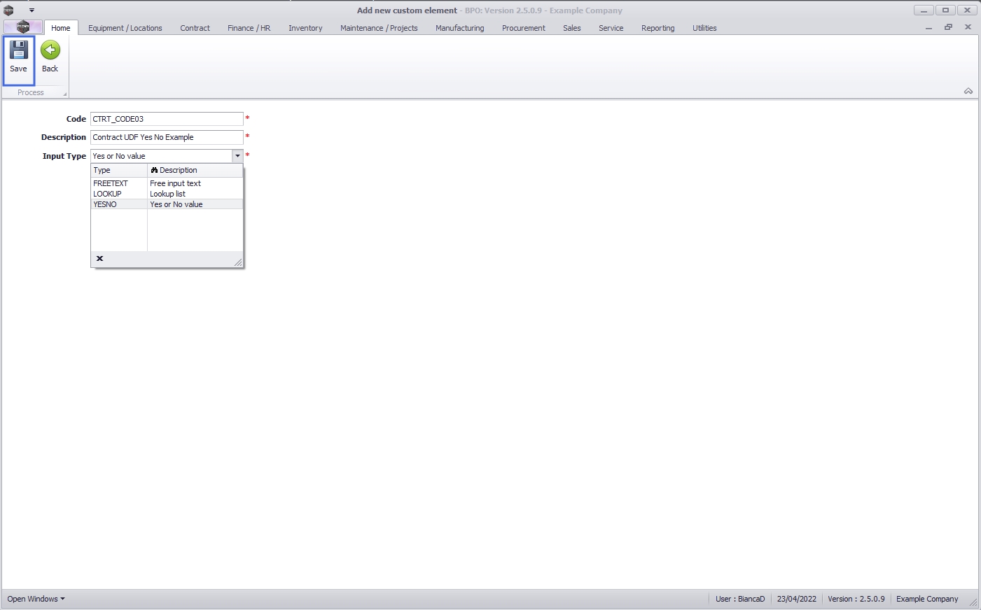 - Type in a Code and Description for the new User Defined Field.