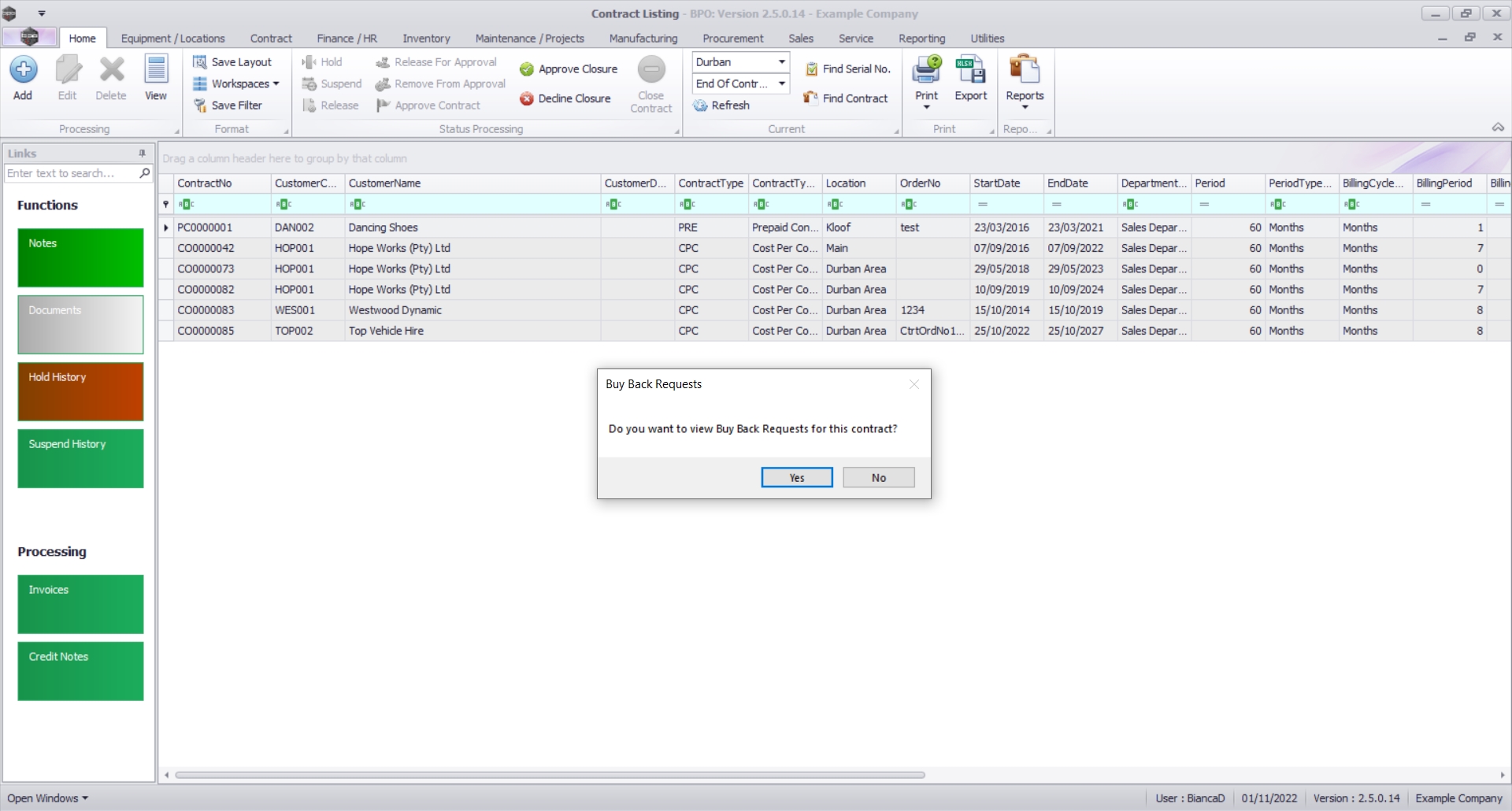 If any Buy Back Requests were created via Contract Expiry that have not yet been approved, you will be asked if you would like to view those requests: Do you want to view Buy Back Requests for this contract?