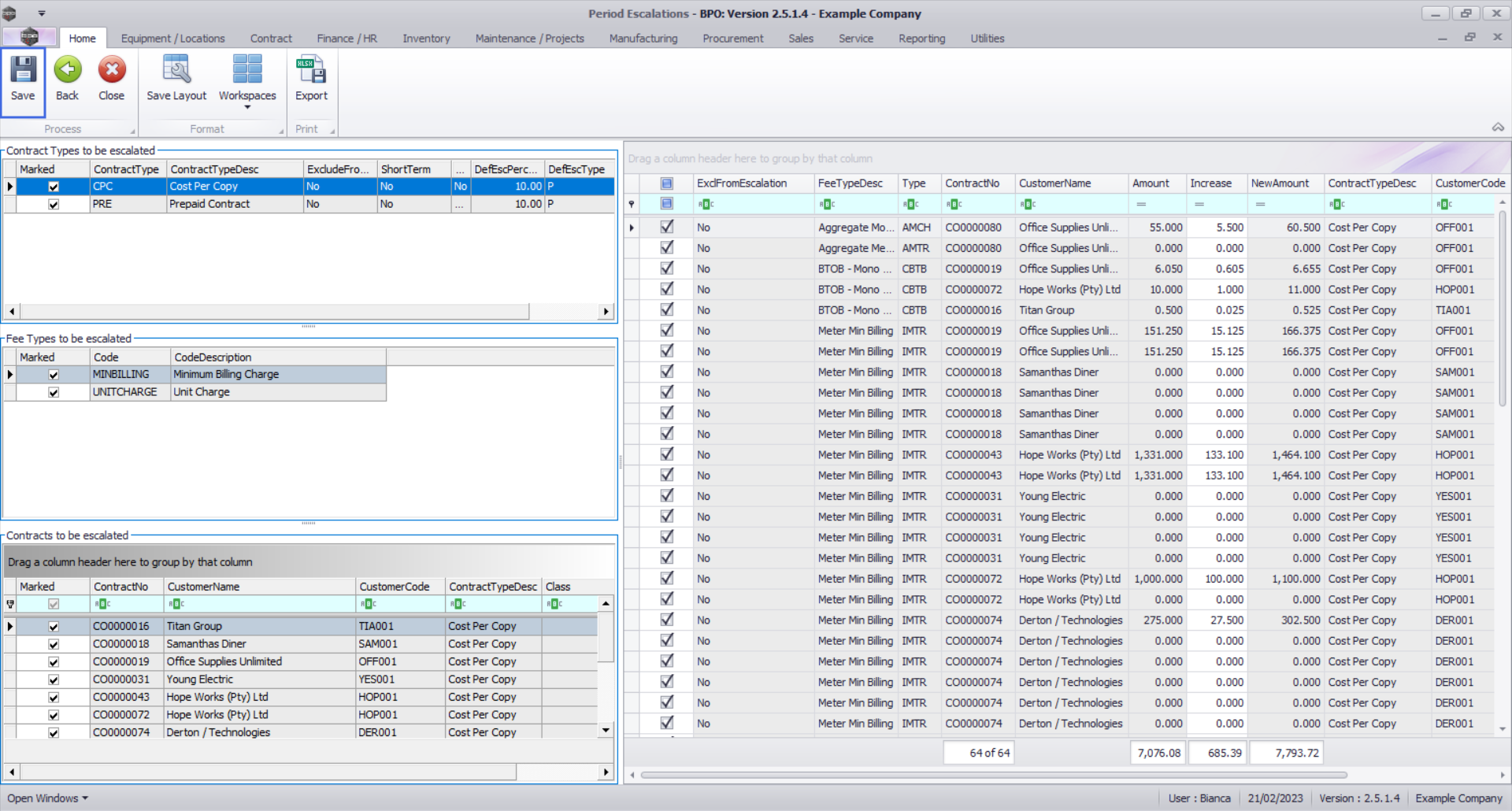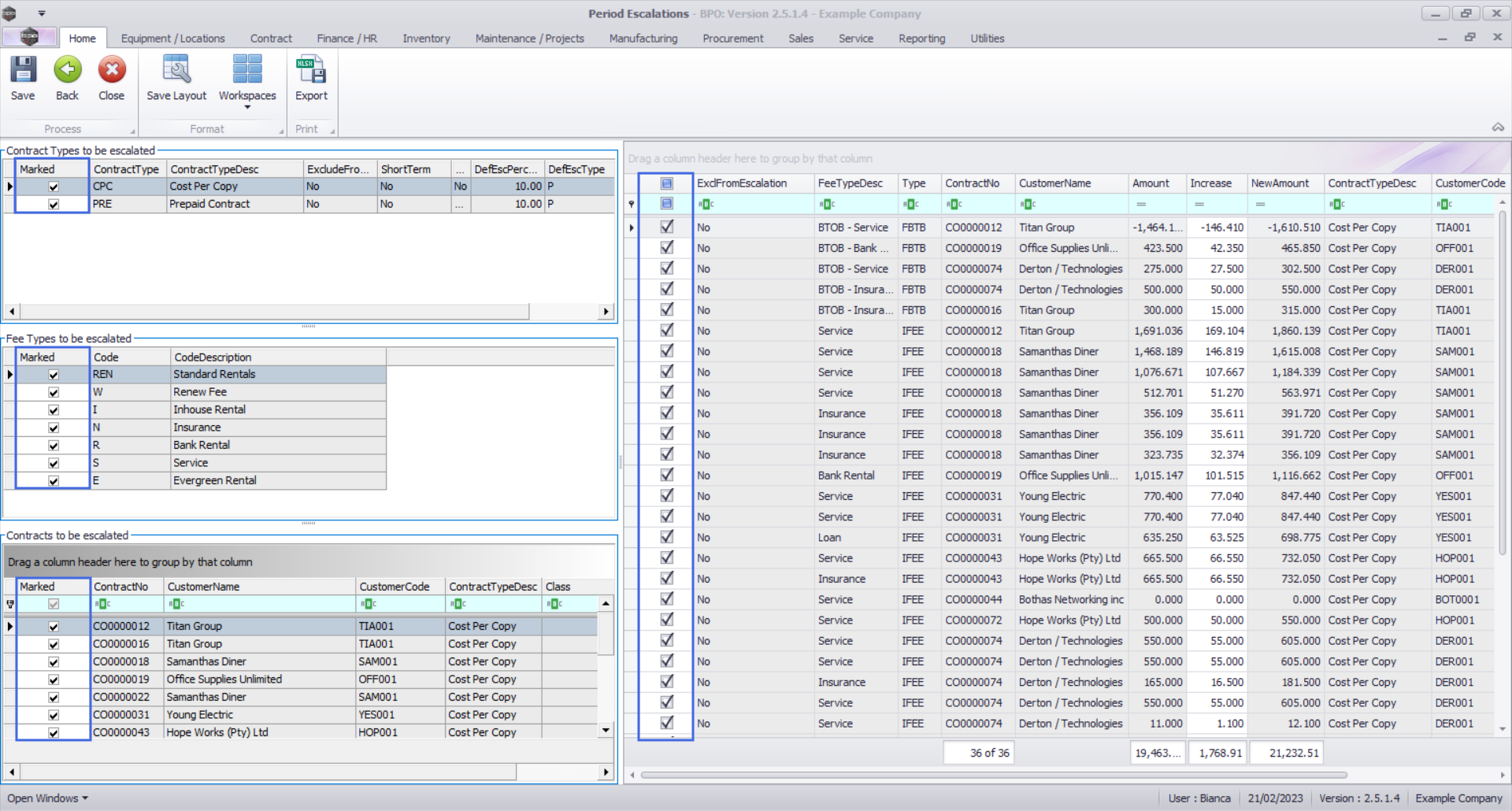 - You can use the Marked check boxes to select the Contract Types, Fee Types, Contracts, Contracts Items that you wish to escalate.