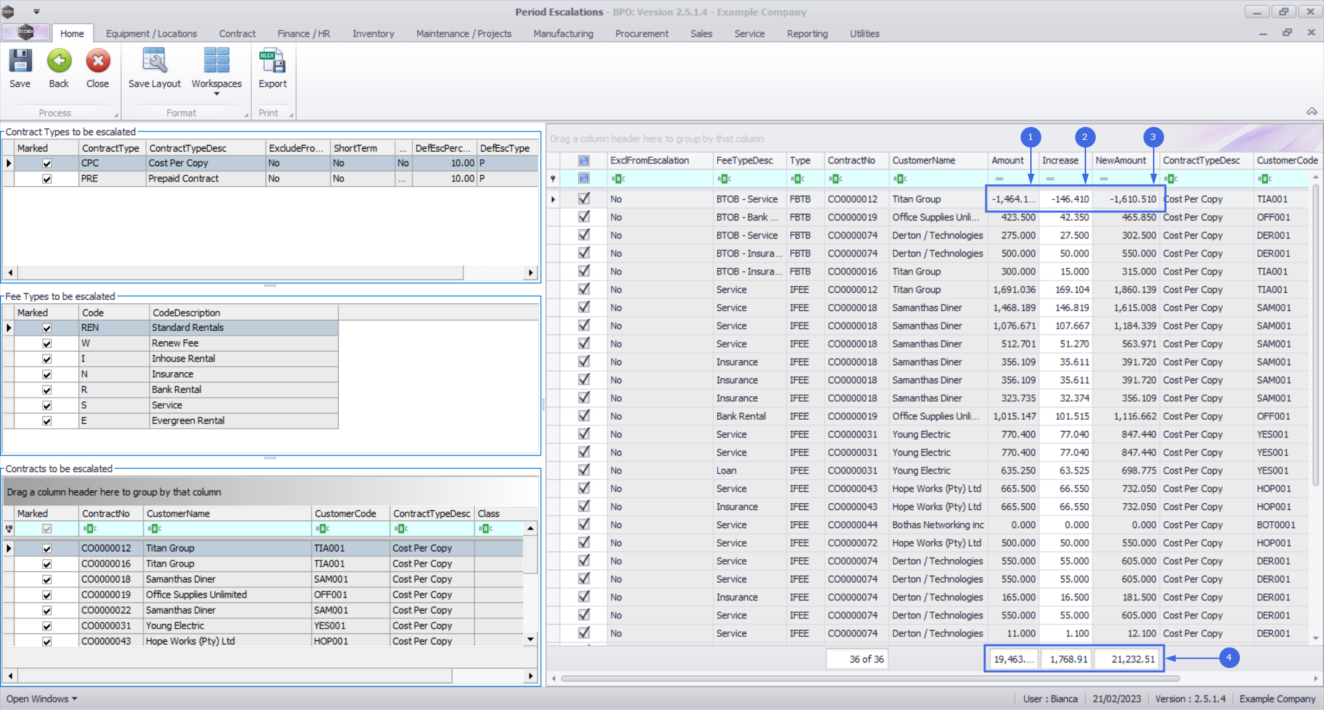 - The No Fee Items column will show you the number of contract item fees that are to be escalated in the relevant billing period.