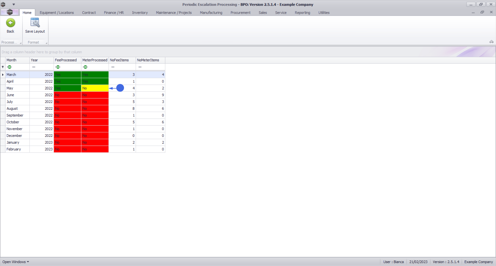 - The No Meter Items column will show you the number of contract item meters that are to be escalated in the relevant billing period.