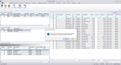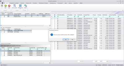 Upon opening, this processing screen displays a list of contract billing periods with processing and count columns for Fee and Meter charges.