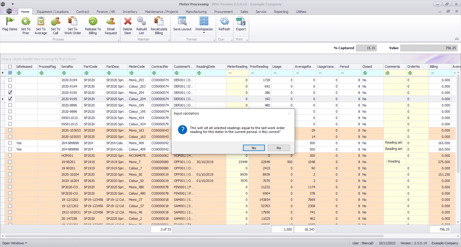 - This will set all selected readings equal to the last work order reading for this meter in the current period. Is this correct?