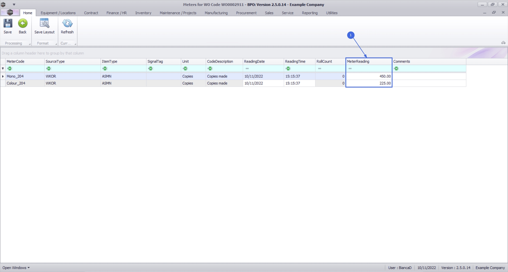 - In this example, the Mono meter reading is now 450 and the Colour meter reading is now 225 which (as shown in the next image) is the same as the last Work Order reading in the current period.
