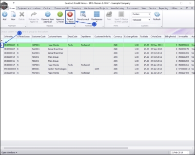 1. Select the row of the contract credit note that you wish to reject.