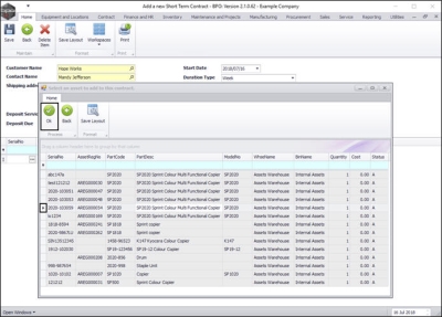 Note: As explained in the introduction, only internal assets can be linked to a short term contract. In this image you can see in the Warehouse Name and Bin Name columns, that the system has only displayed the parts available in the Assets Warehouse and the Internal Assets bin.