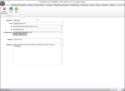 - Email: - can attach documents, add recipients, the system will create a PDF and email the Invoice.