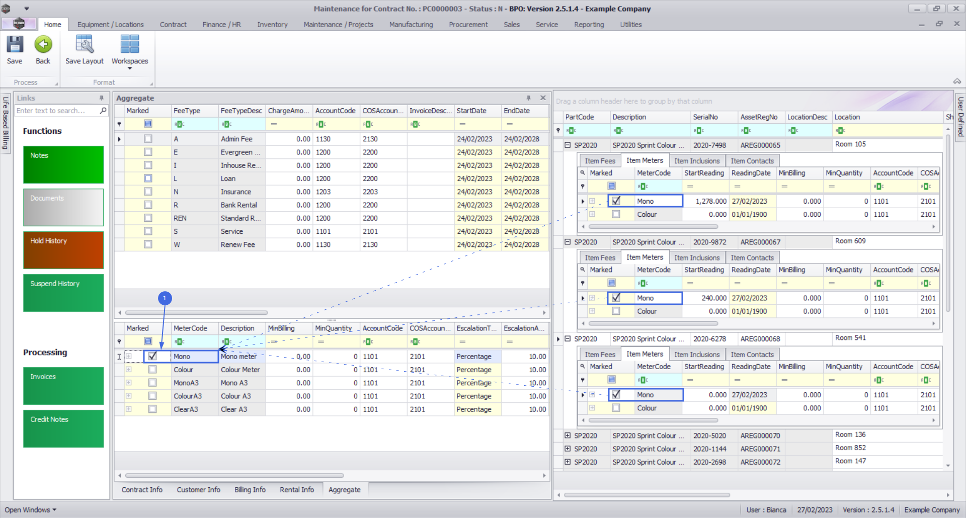 - Marked: Select the item meters that need to be aggregate in the Item Meters tab on all contract items included in aggregate billing, e.g. if Mono meter is aggregate, select the Mono meter on all contract items included in aggregate billing.