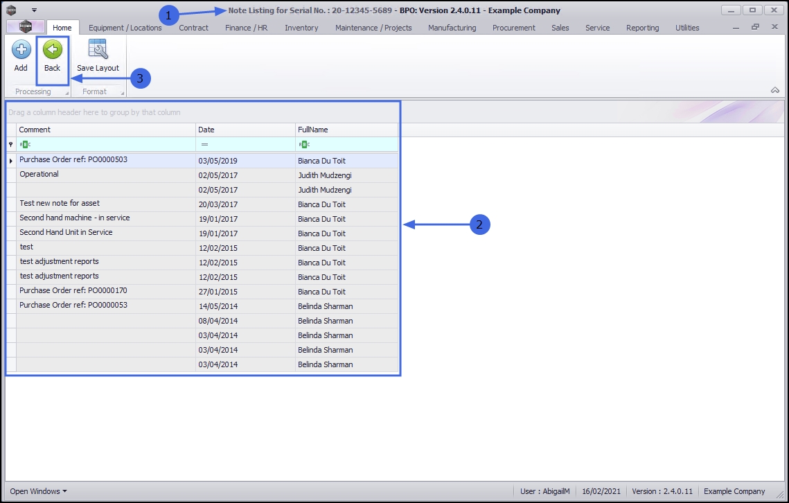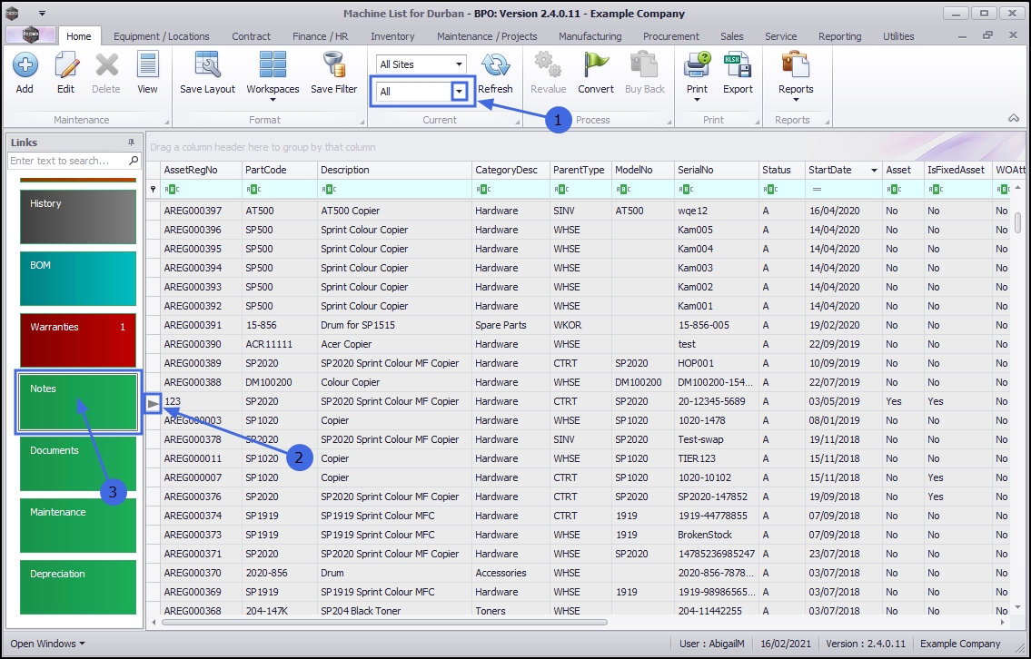 - Here you can view a list of all the notes linked to the selected asset.