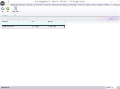 - The Note Listing for Serial No.: [] screen will open.