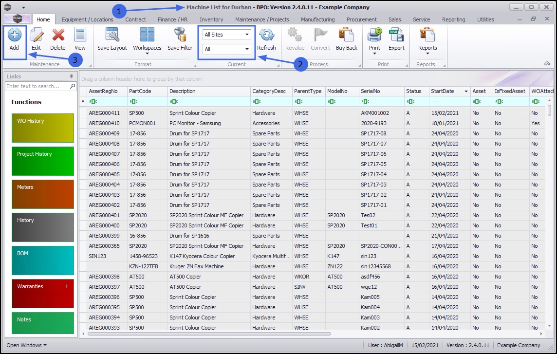 In this process, we will navigate from the Asset Listing (Machine List for []) screen. A customer asset can also be added from the Customer Listing screen.