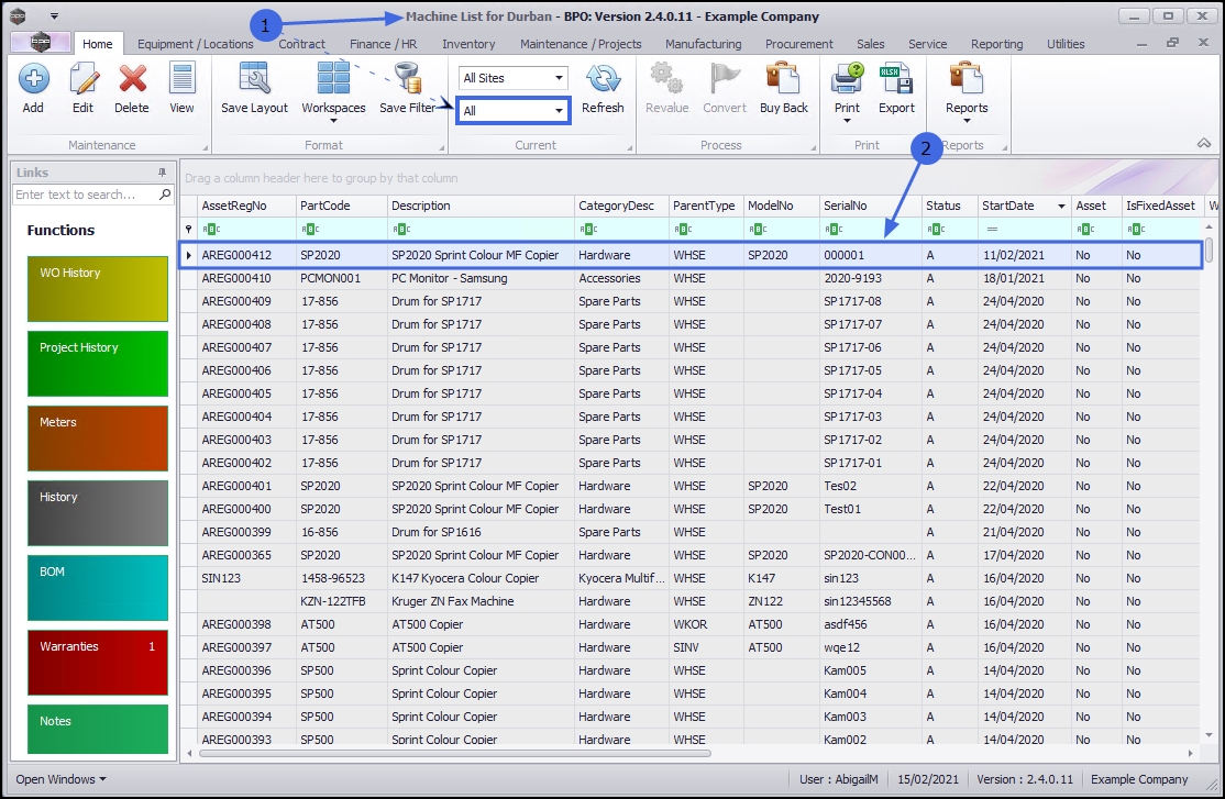 - The Machine List for [Site] screen will be displayed.